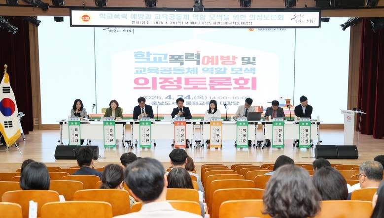 도의회는 24일 충남도서관 문화교육동 대강당에서 「학교폭력 예방 및 교육공동체 역할 모색」을 주제로 의정토론회를 개최했다. 이번 토론회는 학교폭력을 단순 처벌로 대응하는 것을 넘어 상호 존중과 공감, 공동체성 회복을 지향하는 예방 중심의 정책 방향 전환을 논의하기 위해 마련됐다.