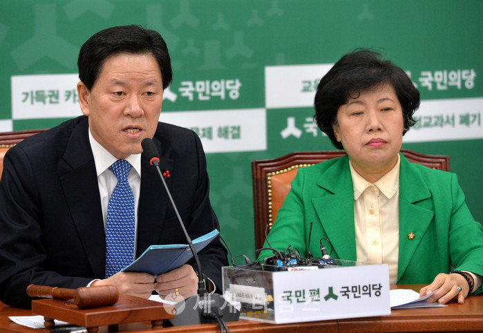 19일 오전 서울 여의도 국회 국민의당 원내대표실에서 열린 원내정책회의에 참석한 주승용(왼쪽) 원내대표가 모두발언하고 있다. 오른쪽은 조배숙 정책위의장. 주 원내대표는 더불어민주당 문재인 전 대표, 박원순 서울시장, 이재명 성남시장 등 대선주자들이 군 복무 기간 단축과 국민 수당 지급, 일자리 창출 등 인기에 치중한 공약들을 남발하고 있다라며 비판했다. 2017.01.19.
