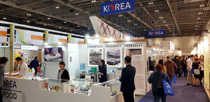 | ▲해외바이어들이 2019영국런던식음료전시회의 한국음식존을 살펴보고 있다. |