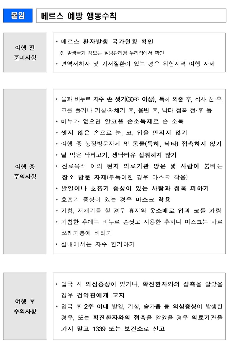 울산시 관계자는 “중동지역 방문자는 귀국 후 2주 이내 증상이 발생하면, 의료기관을 직접 방문하지 마시고 질병관리청 콜센터(1339) 또는 보건소로 즉각 연락해 주시길 당부드린다”라고 말했다.