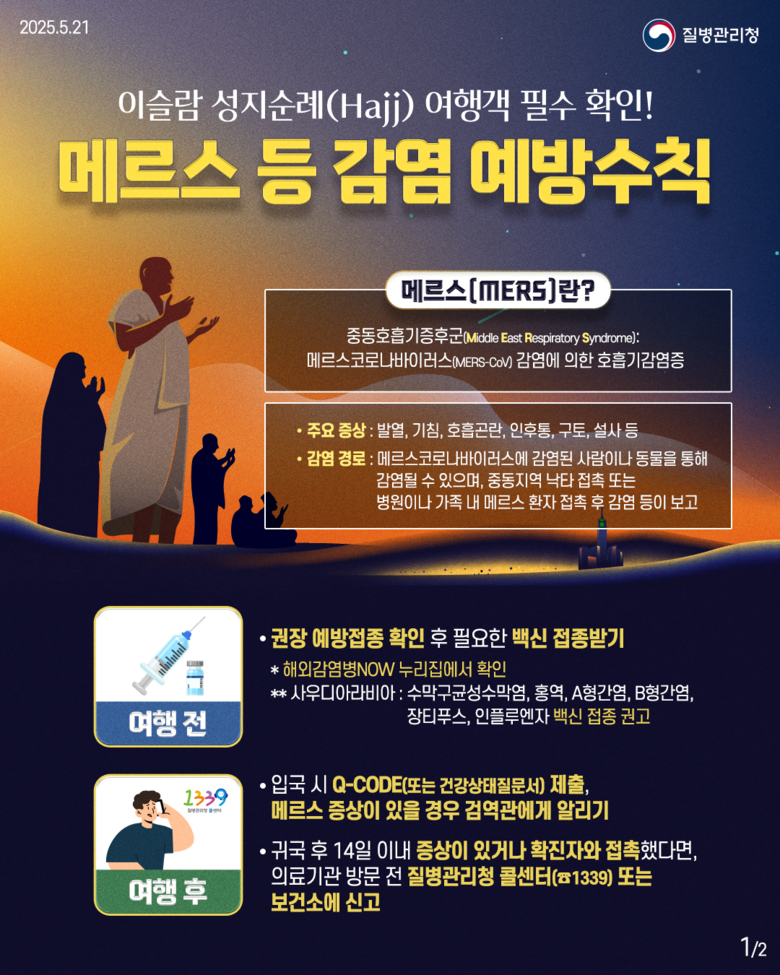 중동지역 방문 후 호흡기증상 발생 시 즉시 신고 당부 [울산 세계타임즈=이호근 기자] 울산시는 이슬람 하지(Hajj) 성지순례 기간(6월 4일~6월 9일)이 도래함에 따라, 사우디아라비아 방문객들에게 중동호흡기증후군(Middle East Respiratory Syndrome, 이하 메르스) 및 수막구균 감염증(Meningococcus disease)에 각별히 주의할 것을 당부하고 나섰다.