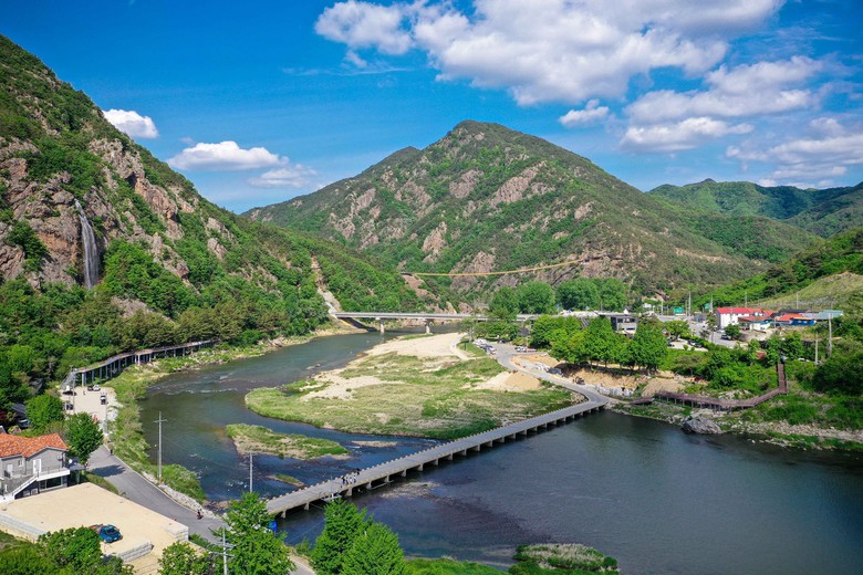 다리 아래로 흐르는 금강 물줄기를 따라 걸으면 흔들리는 다리의 아찔함과 함께 수변 경관의 매력을 느낄 수 있고, 출렁다리와 이어진 덱길을 이용하면 원골 인공폭포가 시원하게 흐르는 모습도 볼 수 있다.