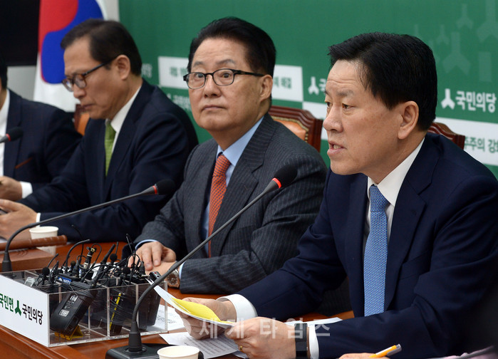 3일 오전 서울 영등포구 여의도 국회 국민의당 당대표실에서 열린 제19차 최고위회의에 참석한 주승용(오른쪽) 원내대표가 모두발언 하고 있다. 오른쪽부터 주승용 원내대표, 박지원 대표, 문병호 최고위원. 2017.03.03.
