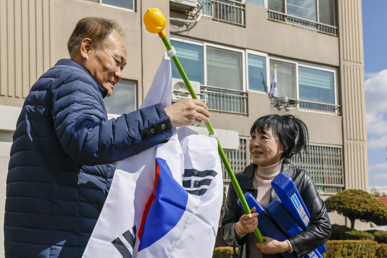 | ▲ 김금숙(오른쪽) 무성아파트 이장이 아파트 앞에서 주민에게 태극기를 건네며 삼일절 태극기 달기 운동의 의미를 설명하고 있다. |