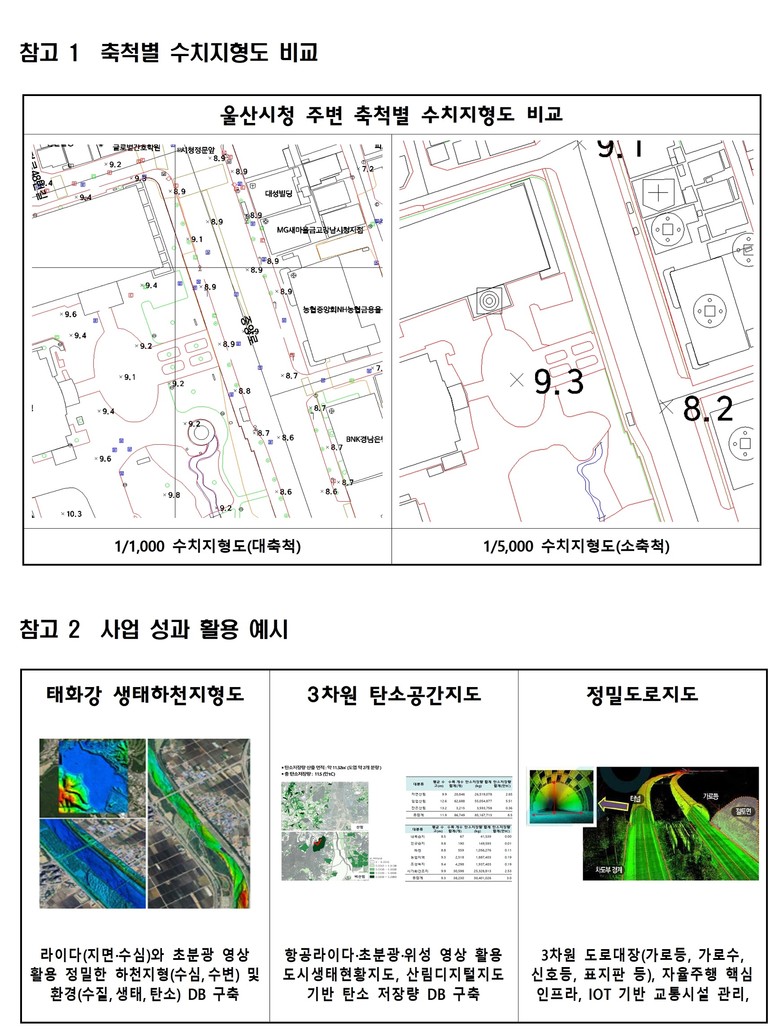 한편 울산시는 지난해에도 이 사업에 선정되어 35억 원의 사업비로 개발제한구역과 주요 개발사업지 약 183㎢에 대한 수치지형도를 제작 중에 있으며, 오는 2026년까지 울산 전역에 대한 최신의 수치지형도를 완성할 예정이다.
