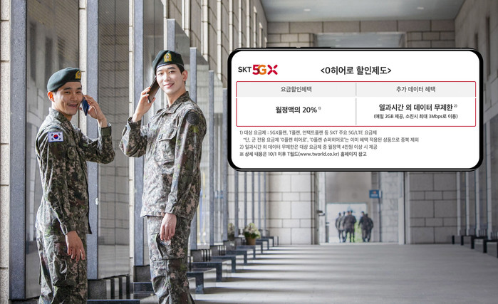 ‘0히어로 할인제도’는 SKT회선을 사용하는 군인 고객에게 요금제에 따라 20% 요금할인과 일과시간 외 무제한급 데이터를 추가로 제공하는 프로그램이다.
