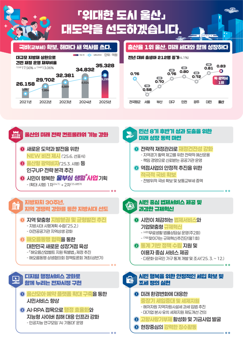 울산시 관계자는 “위대한 도시 울산 대도약을 실현하기 위해 정책과 사업을 체계적으로 추진하고 도시 경쟁력을 강화함과 동시에 시민의 삶의 질을 높이는 데 집중할 계획이다”라며 “미래 성장 기반을 확고히 다져 시민 모두가 행복한 지속 가능한 도시를 만들어 나가는 데 최선을 다하겠다”라고 말했다.