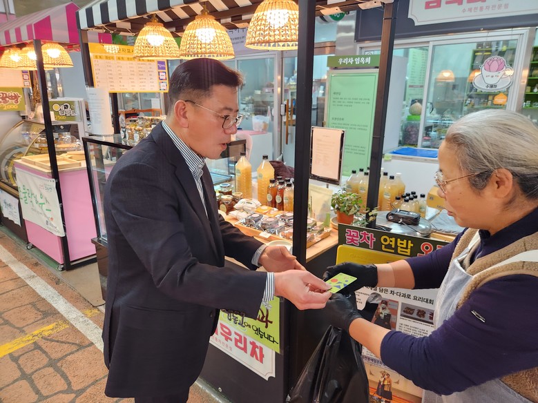 아울러, 옥천공설시장에서 설날에 필요한 식자재, 먹거리 등을 구매하며 위축된 지역경제 활성화에도 일조하였으며, 전통시장 곳곳을 둘러보며 시장 상인들과 소통하는 시간을 가졌다.