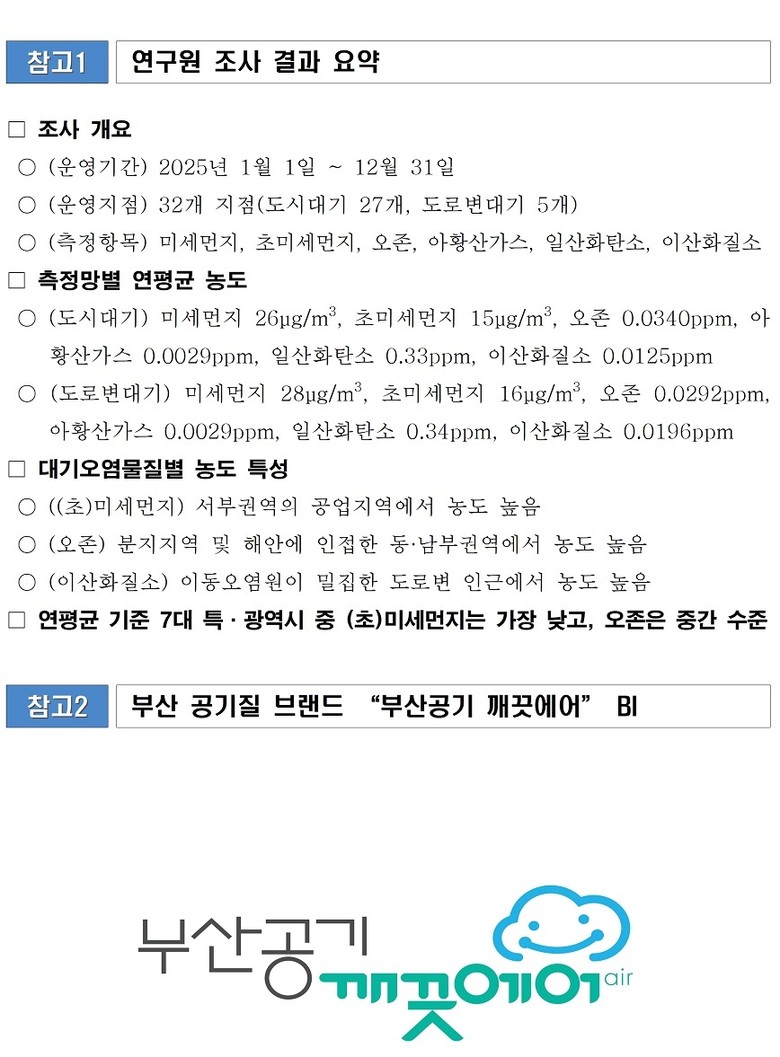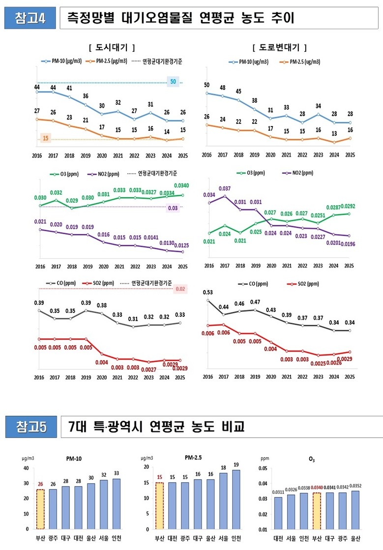 박형준 시장은 “부산은 7대 특·광역시 중 (초)미세먼지 연평균 최저 농도를 유지하고 있는 만큼, 앞으로도 맑고 깨끗한 공기질을 지켜나가도록 노력하겠다”라며, “시민 여러분도 배출가스 5등급 차량 운행 제한, 노후 경유차 저공해 조치 등 대기질 개선 정책에 적극적으로 동참해 주시길 부탁드린다”라고 전했다.