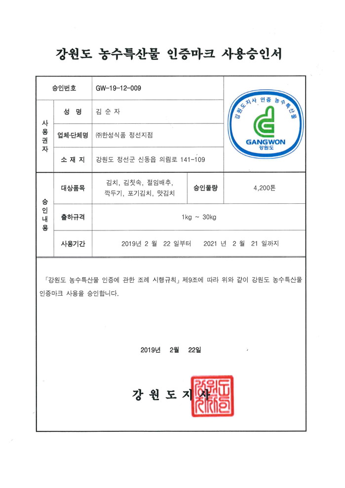 이는 강원도청으로부터 정선공장의 포기김치, 맛김치, 깍두기, 김칫속, 절임배추 등의 전통김치에 대해 "농수산특산물 인증마크"를 받은 것으로 강원도는 ‘강원도 농수산특산물 인증에 관한 조례’에 의거, 강원도 지역 생산 제품에 대해 인증마크를 부여하고 있다.