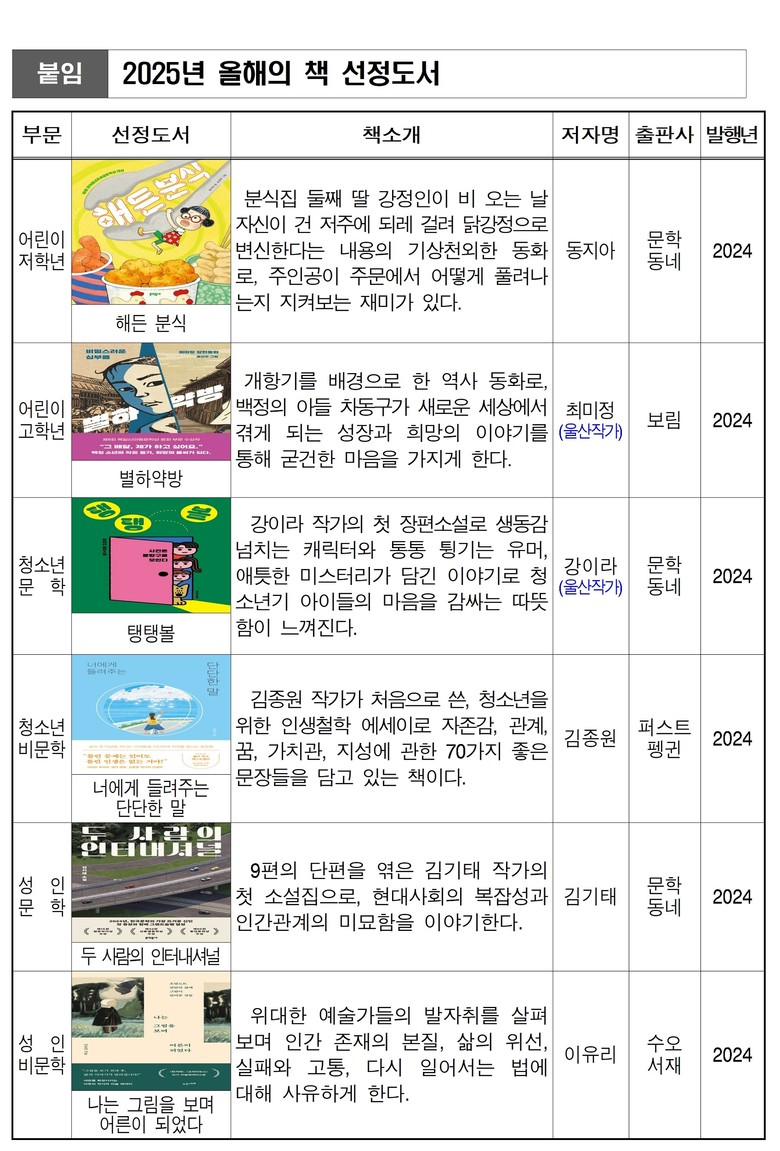 올해의 책으로는 ▲어린이 저학년 부문 동지아 작가의 ‘해든 분식’ ▲어린이 고학년 부문 최미정 작가의 ‘별하약방’ ▲청소년 문학 부문 강이라 작가의 ‘탱탱볼’ ▲청소년 비문학 부문 김종원 작가의 ‘너에게 들려주는 단단한 말’ ▲성인 문학 부문 김기태 작가의 ‘두 사람의 인터내셔널’ ▲성인 비문학 부문 이유리 작가의 ‘나는 그림을 보며 어른이 되었다’가 선정됐다. 특히, 어린이 고학년 부문 최미정 작가와 청소년 문학 부문 강이라 작가는 울산출신 작가로 의미가 깊다.