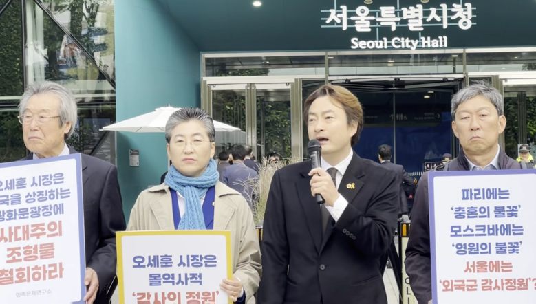 또한 “세종대왕은 인류사에서 보기 드문 백성 중심의 통치자다. 그런 세종 옆에 전쟁의 상징물을 세우는 것은 시민 감수성과 동떨어진 시대착오적 행위”라고 말했다.