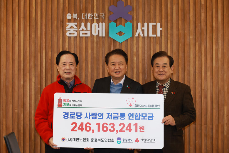 이날 기탁식에는 김영환 충북도지사를 비롯해 이명식 대한노인회 충북도연합회장 및 시군 지회장, 이민성 충북사회복지공동모금회장 등이 참석했다.