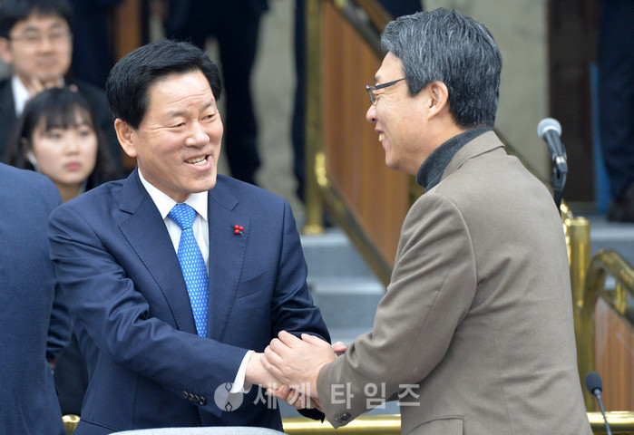 5일 오전 서울 여의도 국회 제3회의장에서 열린 의원총회에 참석한 국민의당 주승용(왼쪽) 원내대표가 경선에서 맞붙었던 김성식 전 정책위의장과 악수하고 있다. 2017.01.05.