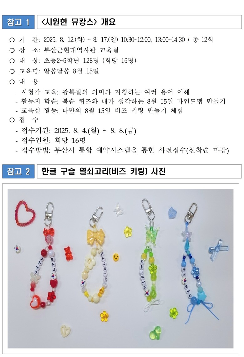이번 교육프로그램은 ▲광복절의 의미 학습 ▲8월 15일 마인드맵 작성 ▲한글 구슬 열쇠고리(비즈 키링) 만들기 체험 순으로 진행된다.