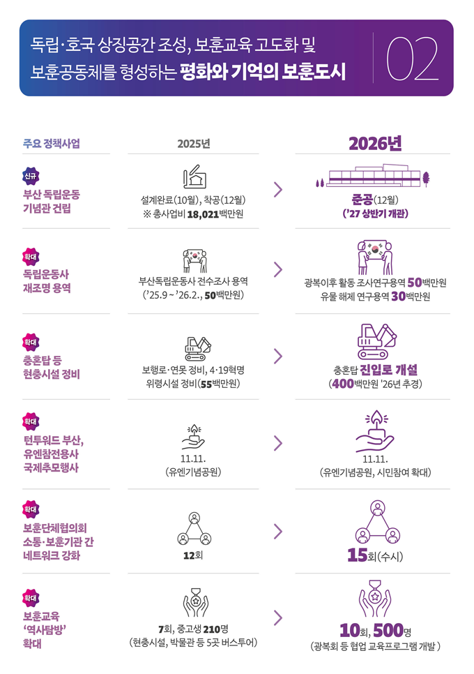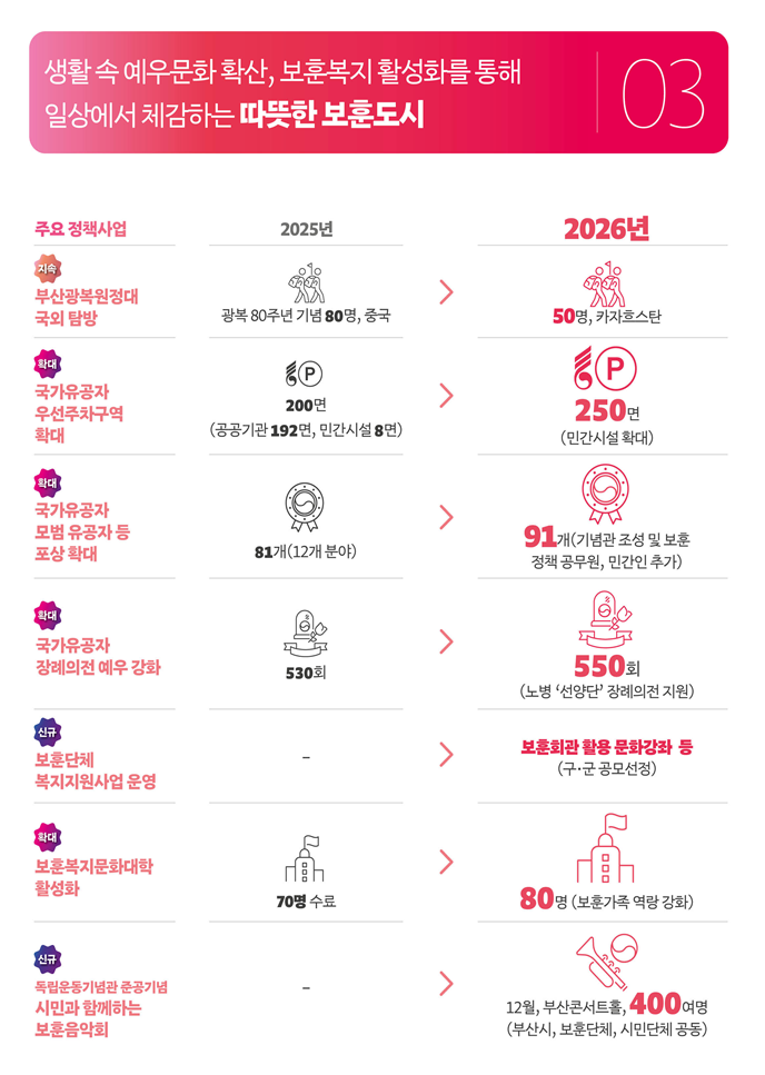독립유공자 후손과 시민이 함께하는 부산광복원정대를 통해 참여형 보훈을 일상으로 확산하고, 국가유공자 우선주차구역을 늘려 생활 속 예우를 정착시키며, 국가유공자 장례 시 의전 지원을 확대해 국가를 위해 희생한 영웅들의 마지막 순간까지 예우를 다할 계획이다. 아울러 보훈회관을 활용한 문화·복지 프로그램을 운영해 고령 보훈대상자의 사회적 고립을 예방해 나갈 방침이다.