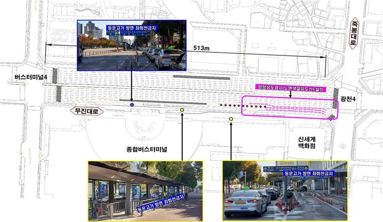 또 터미널 내부에서 진출하는 상당수의 차량이 동운고가 방면 좌회전 금지에도 불구하고 광천사거리로부터 90m 내 짧은 구간에서 5개 이상의 차로를 무리하게 변경하면서 불법으로 좌회전하고 있어 교통체증과 사고 위험성이 높은 지역이다.