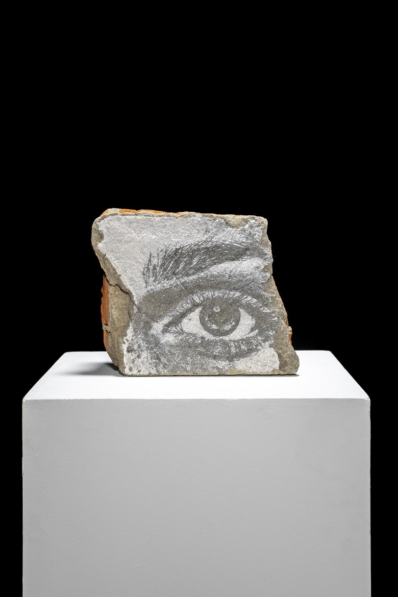 | ▲ 스플리터 시리즈 #13, 2021, 27.5x33x14.5cm, 철거된 건물의 잔해에 레이저로 음각된 조각(벽돌, 석고, 콘크리트, 페인트) |