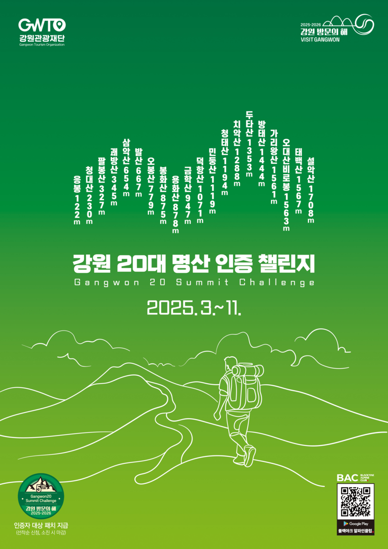 강원관광재단 최성현 대표이사는 “매년 ‘강원 20대 명산 인증챌린지’에 참여해 주시는 참가자분들의 열정에 깊이 감사드린다”며, “재단은 본 사업을 지속적으로 추진하여 강원의 산악관광 활성화에 앞장서겠다”고 밝혔다.