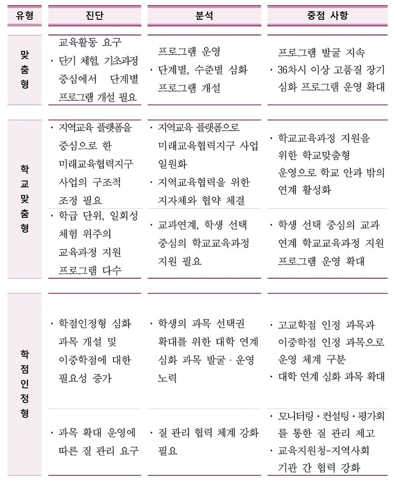 먼저 ‘지역맞춤형’ 유형은 지역 수요 기반 교육자원을 연결해 학생의 주도적 성장을 지원하는 유형이다. 기존 5개 유형을 통합하고 수요에 따라 상시 개설·위탁 프로그램으로 재구성한다. 특히 36차시 장기 심화 과정을 확대하고 학생 제안 프로그램도 적극 반영한다.