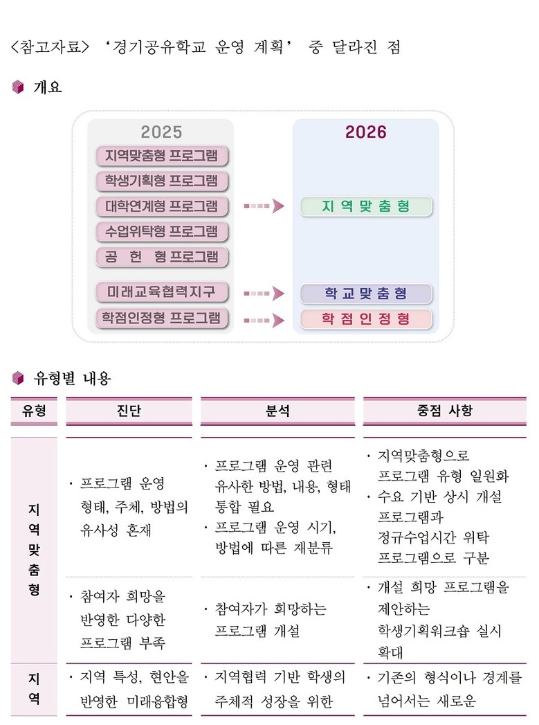 도교육청 지역교육정책과 조병익 과장은 “ 2026 경기공유학교는 유형을 단순히 줄인 것이 아니라 학교에서 시작한 배움이 지역과 온라인학교로 확장되도록 학습 구조를 재설계한 것”이라며 “학생이 어디에서 배우든 지속적으로 성장할 수 있도록 통합 지원 체계를 발전시켜 나가겠다”고 말했다.