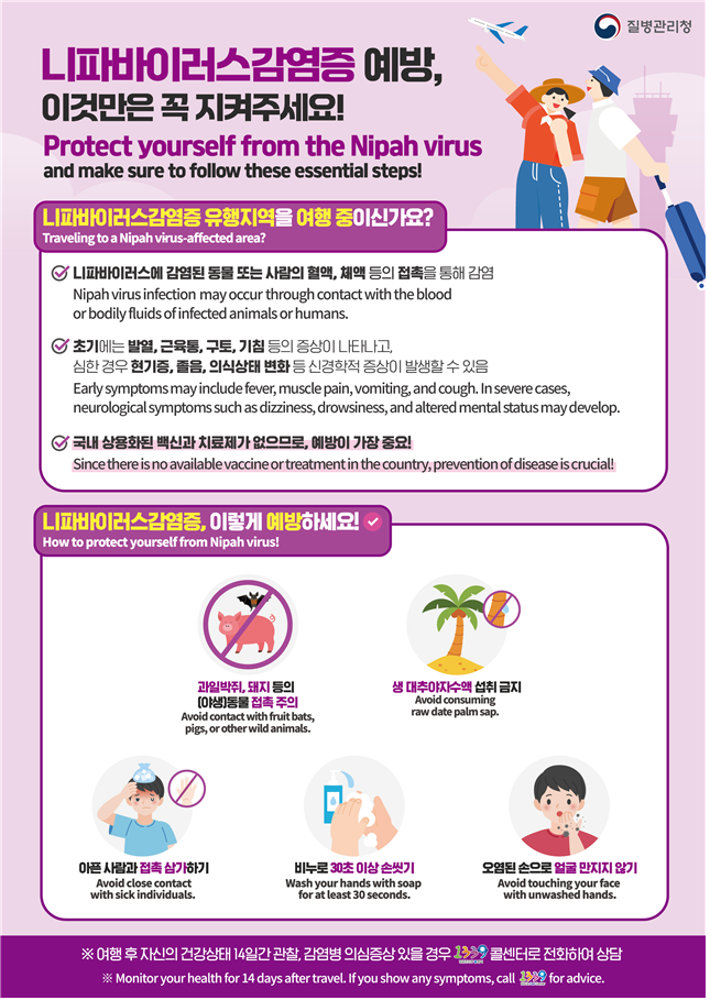 인도에서는 높은 치명률로 철저한 관리가 필요한 니파바이러스감염증*이 유행 중이며, 일부 동남아 국가에서 동물인플루엔자 인체감염증(AI)이, 중동 지역에서는 중동호흡기증후군(MERS)이 지속적으로 발생하고 있다.