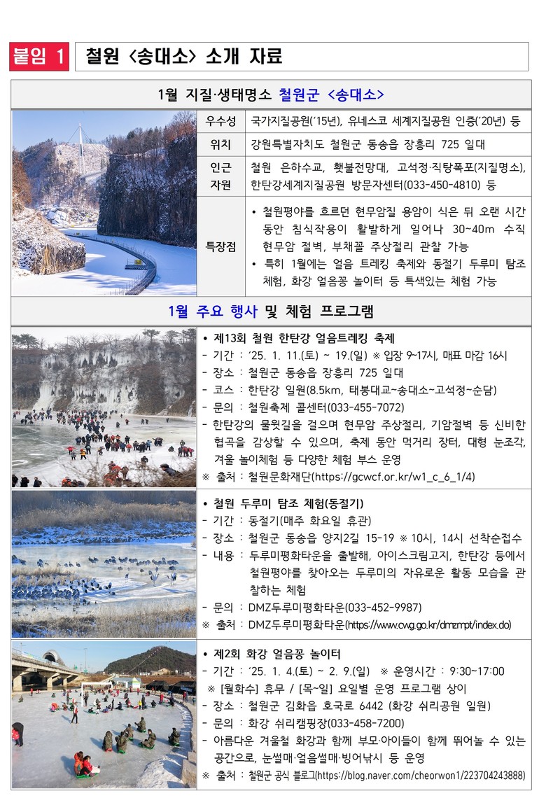▶ 1월 중 한탄강 얼음트레킹 축제(1.11.~19.), 두루미 탐조 체험 등 다채로운 행사 운영 [강원도 세계타임즈=김민석 기자] 강원특별자치도(도지사 김진태, 이하 ‘도’)는 도내 자연생태자원의 우수성과 특별함을 알리고, 명소 홍보 및 활성화를 위해 2025년 1월부터 매달 한 곳을 「이달의 지질·생태명소」로 선정해 소개할 계획이다. 첫 번째 명소로 철원군의 <송대소>를 선정되었다.