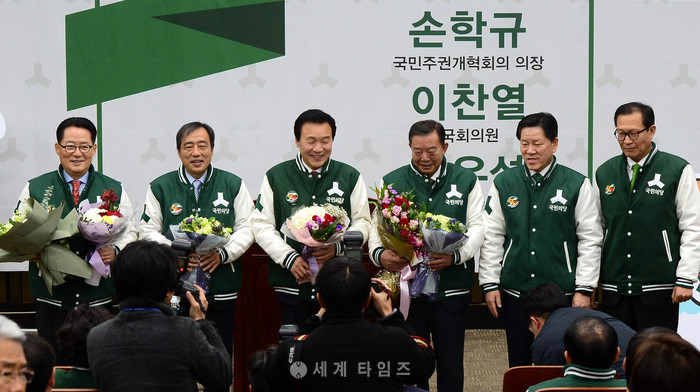 손학규 국민주권개혁회의 의장 국민의당 입장식이 17일 오전 서울 여의도 국회에서 열려 박지원 대표를 비롯한 당 지도부와 손학규 의장이 포즈를 취하고 있다. 이날 손 의장 측근인 이찬열 의원, 박우섭 인천 남구청장도 함께 입당했다. 사진 왼쪽부터 국민의당 박지원 대표, 박우섭 인천 남구청장, 손학규 국민주권개혁회의 의장, 이찬열 의원, 국민의당 주승용 원내대표, 국민의당 문병호 최고위원. 2017.02.17.