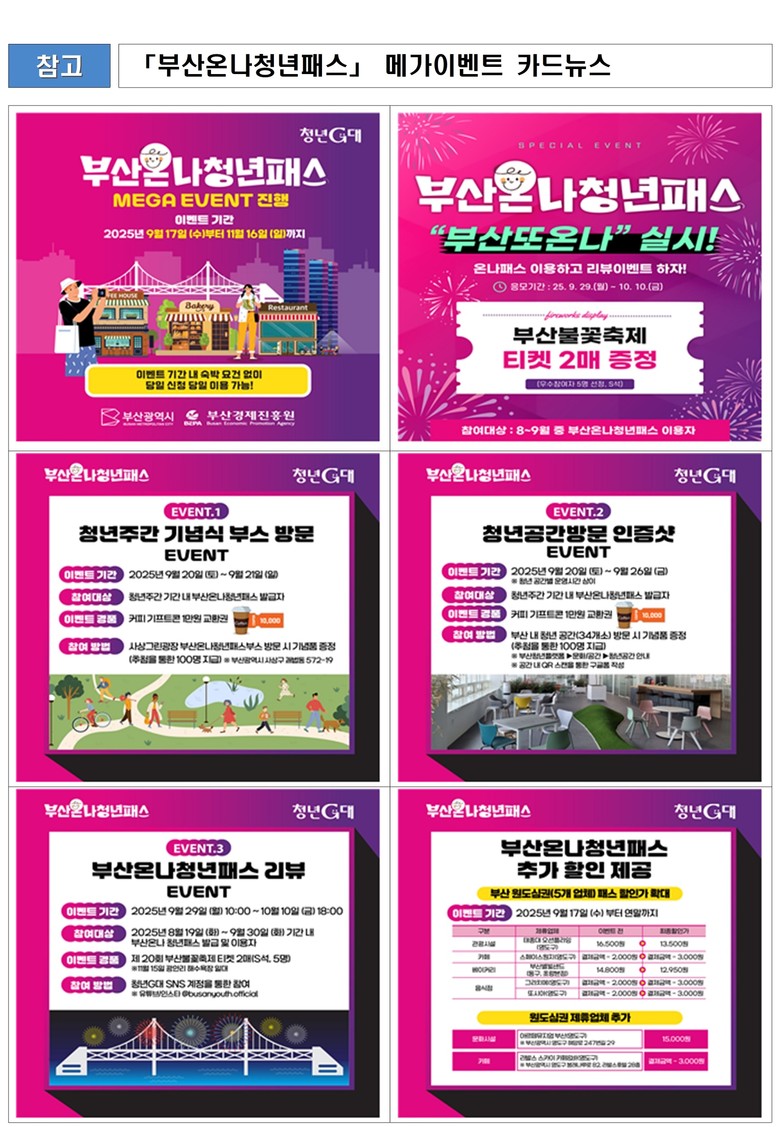 이번 이벤트는 9월부터 11월까지 ▲제30회 부산국제영화제(BIFF)(9.17.~9.26.) ▲페스티벌 시월(9.21.~10.3.) ▲부산불꽃축제(11.15.) ▲지스타 2025(11.13.~11.16.) 등 국내외 청년들이 집중적으로 찾는 굵직한 행사를 맞이해 기획됐다.