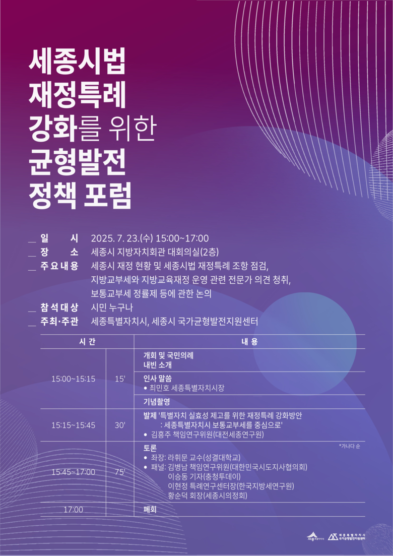 이번 포럼은 세종의 재정현황을 점검하고 지방교부세.지방교육재정 운영 및 보통교부세 정률제 등에 대한 논의를 통해 세종시법 재정특례를 강화하고자 기획되었다.