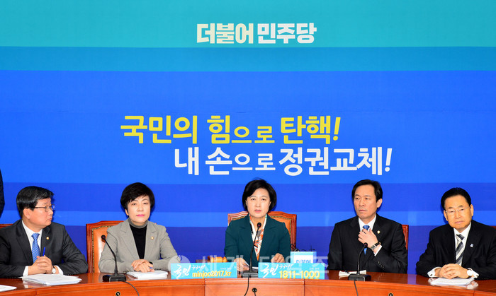 17일 오전 서울 여의도 국회 더불어민주당 대표실에서 열린 최고위원-탄핵소추위원 연석회의에서 추미애(가운데) 대표가 발언을 하고 있다. 2017.02.17.