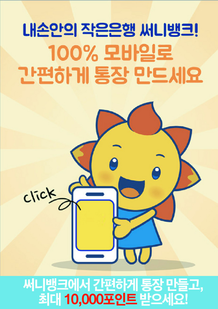 2015년 12월 은행권 최초로 비대면 신규서비스를 시작한 써니뱅크는 프로세스 개선을 통해 새로워진 비대면 입출금 계좌신규 서비스를 제공하고 있다. 공인인증서가 없어도, 회원가입을 하지 않아도, 기존 은행거래가 없어도, 스마트폰과 신분증만 있으면 간편하게 입출금 통장을 만들 수 있다.