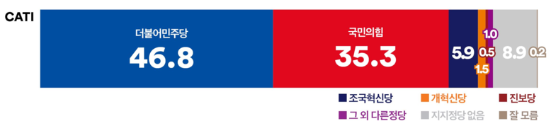 [세계타임즈 = 심귀영 기자] ‘여론조사꽃’이 2월 19일부터 20일까지 이틀간 실시한 전화면접조사에서 ‘더불어민주당’의 지지율은 46.8%, ‘국민의힘’은 35.3%를 기록했다. ‘조국혁신당’의 지지율은 5.9%의 지지율을 보였다. 양당 간 격차는 11.5%p였으며, ‘더불어민주당’과 ‘조국혁신당’의 합산 지지율(52.7%)은 ‘국민의힘’보다 17.4%p 앞선 것으로 나타났다.