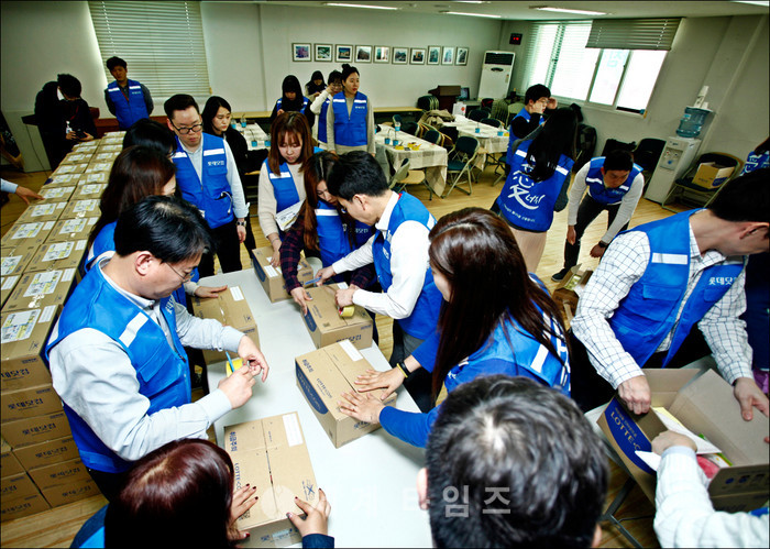 온라인종합쇼핑몰 롯데닷컴은 16일 서울 서대문구 동방사회복지회에서 동방사회복지회와 사회공헌활동을 위한 업무협약(MOU)을 체결했다. 롯데닷컴 샤롯데 봉사단이 드림박스를 제작하고 있다. 입양대기아동을 위한 손수건과 함께 전달되는 드림박스에는 욕실 미끄럼방지매트, 물티슈, 아동용 바디워시를 비롯해 콘센트 안전커버, 모서리 보호대, 색연필 등이 함께 구성됐다. 드림박스들은 택배를 통해 위탁가정에 배송될 예정이다. 2017.03.17. (사진=롯데닷컴 제공)