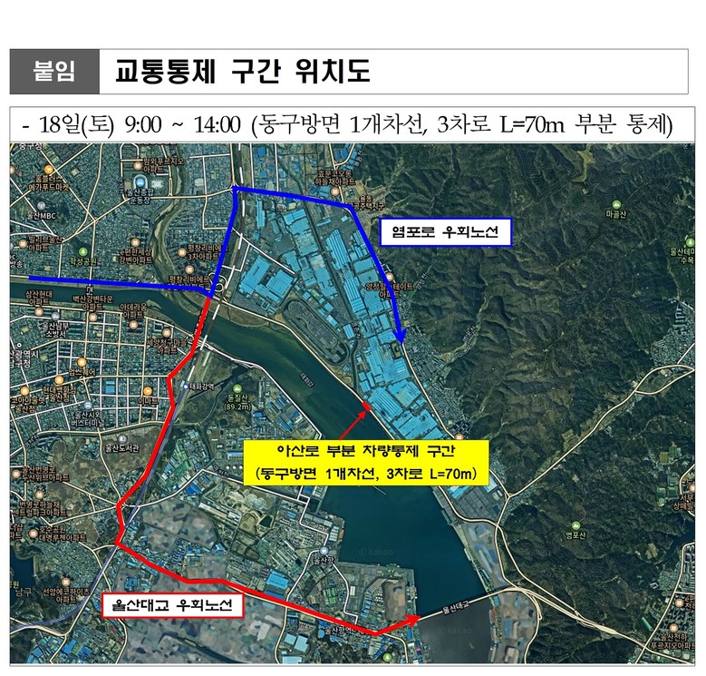 통제 구간은 아산로 현대자동차 4·5공장 일원 동구 방면 1개차선(3차로, L=70m)이다.