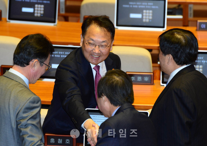 6일 오전 서울 여의도 국회 본회의장에서 열린 제349회 국회 본회의에서 유일호 경제부총리 겸 기획재정부 장관이 바른정당 의원들과 인사를 나누고 있다. 2017.02.06.