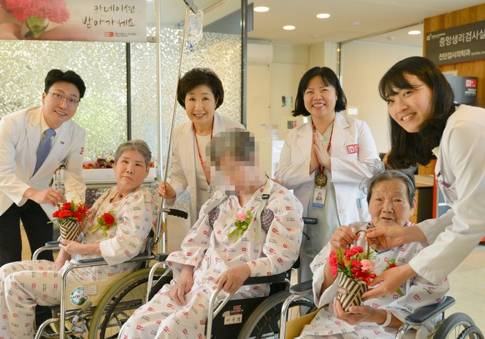 | ▲ 지난 8일 어버이날을 맞아 김상일 병원장(가장 좌측)을 비롯한 H+양지병원 의료진이 외래 및 병동 환자들에게 카네이션을 증정하는 ‘러브 더 카네이션’ 이벤트가 진행했다. |