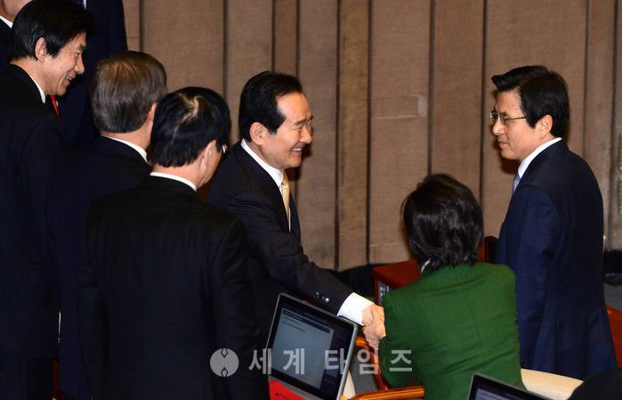 6일 오전 서울 여의도 국회 본회의장에서 열린 제349회 국회 본회의에서 정세균 국회의장이 황교안 국무총리 겸 대통령 권한대행을 비롯한 국무위원들과 인사를 나누고 있다. 2017.02.06.