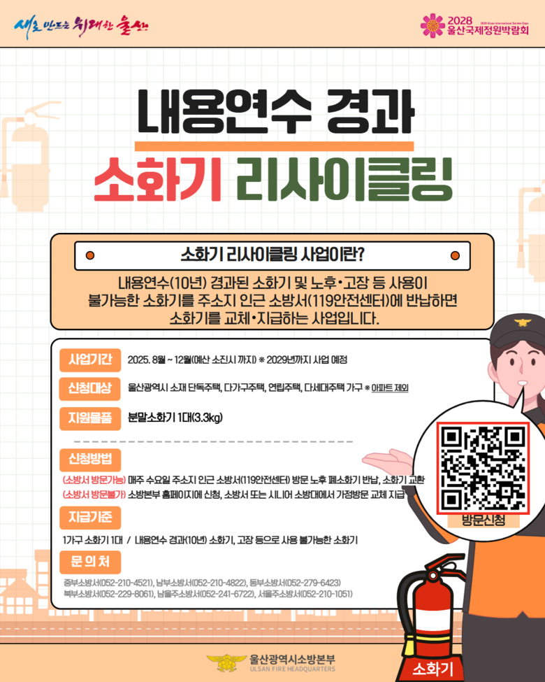 주요 홍보 내용은 ▲내용연수 경과 소화기 교체사업 ▲비상시 신속한 대피를 위한 피난통로 확보 상태 확인 ▲유사시 피난 보조 인력 배치 등이다.