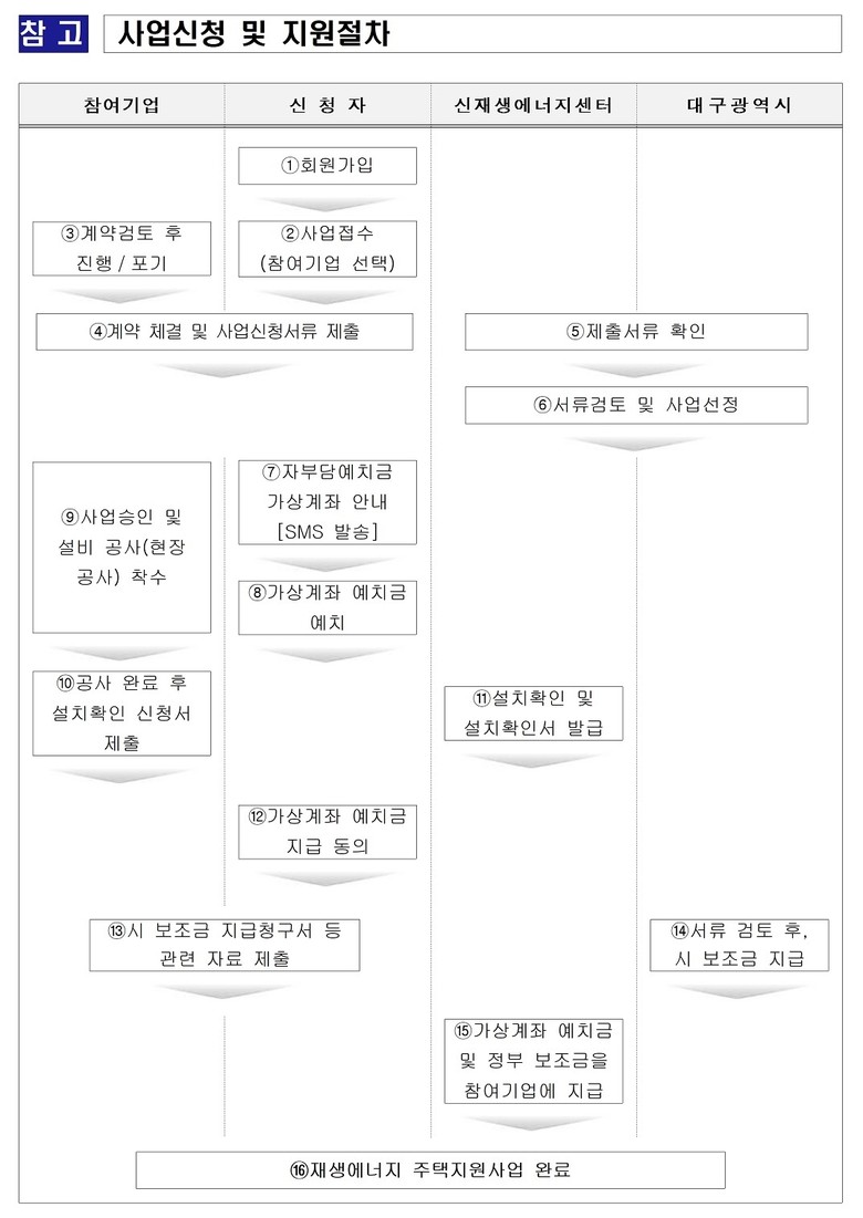 사업 참여를 희망하는 시민은 먼저 각 주택에 적합한 에너지원을 선정해 한국에너지공단 그린홈 홈페이지(nr.energy.or.kr)에 공지된 참여기업과 설치 계약을 체결해야 한다. 이후 공단의 사업 승인을 받아 설비 설치를 완료하고 확인 절차를 거치면 보조금이 지급된다.