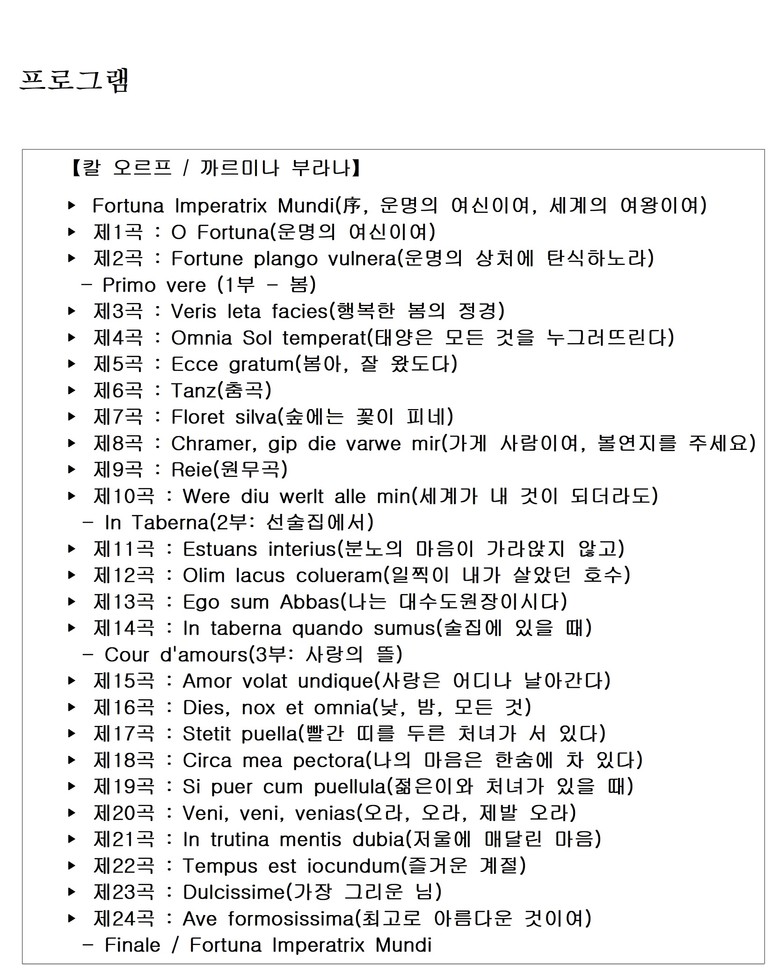 이번 공연에서는 3부 25곡으로 구성된 <카르미나 부라나>(Carmina Burana)를 선보인다.