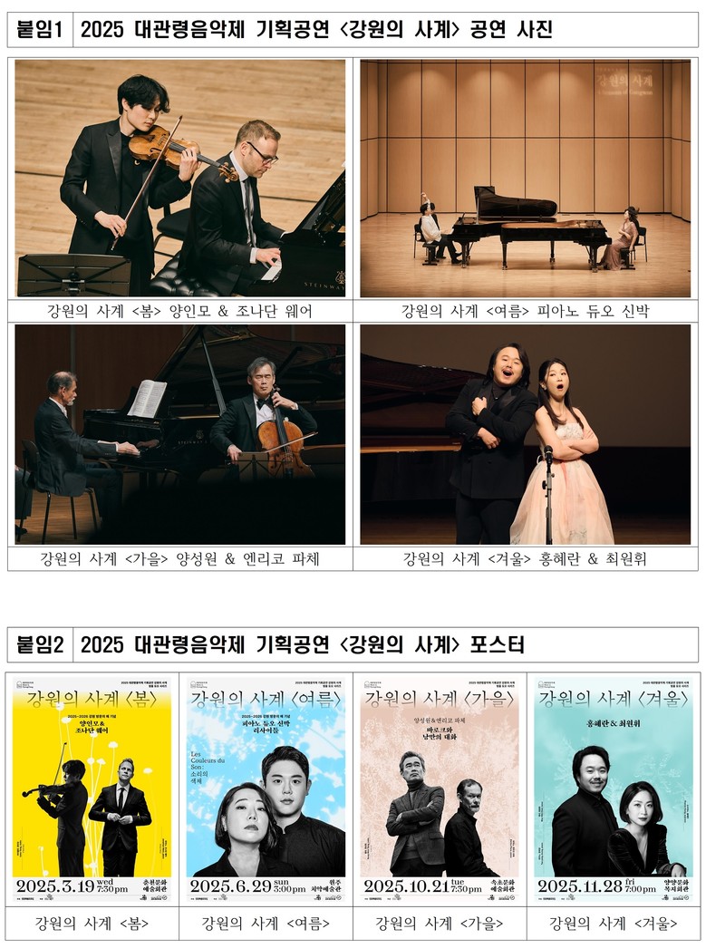 ·양인모·조나단 웨어, 피아노 듀오 신박, 양성원·엔리코 파체, 홍혜란·최원휘가 선보인 명품 듀오 공연 호평 [강원도 세계타임즈=김민석 기자] 강원문화재단(대표이사 신현상)은 2025년 대관령음악제 기획공연 <강원의 사계> 4회 공연을 성황리에 마쳤다고 밝혔다.