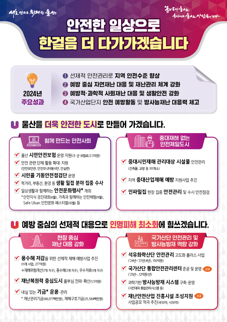 이를 위해 울산시는 2025년 시민안전실 예산으로 786억 원을 책정하고 풍수해 저감을 위한 선제적 예방사업을 시작으로 재난안전사업 추진에 나선다.