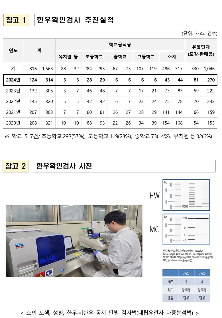 이번 한우 확인검사는 도 교육청과 협업하여 단체 급식을 실시하는 유치원 및 초·중·고등학교에 납품되는 한우 소고기 100건과 식육포장처리업소 및 식육판매업소에서 수거한 소고기 200건을 대상으로 한우와 비(非)한우를 구별할 수 있는 유전자검사*로 진행한다.