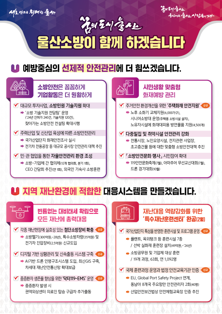 선제적 안전관리와 첨단 대응체계로 안전 선진도시 구현 [울산 세계타임즈=이호근 기자] 울산시 소방본부는 시민들의 안전을 보장하고, 지역 산업과 조화를 이루는 안전도시를 실현하고자 2025년 한 해 동안 다양한 사업을 추진한다고 밝혔다.