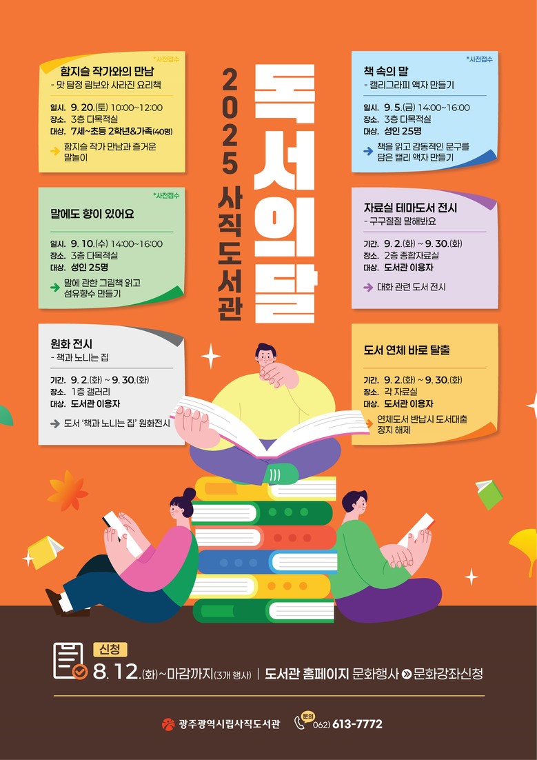 자세한 사항은 시립도서관 누리집(https://citylib.gwangju.go.kr)을 참고하거나 무등(062-613-7727), 사직(062-613-7772), 산수(062-613-7812), 디지털정보(062-613-7767) 도서관으로 문의하면 된다.