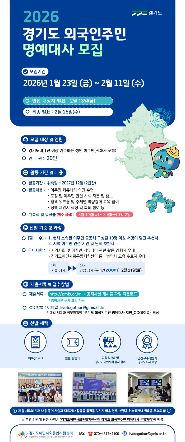 ○ 경기도정 모니터링 및 이주민 정책 발굴·제안 수행 [경기북부 세계타임즈=송민수 기자] 경기도가 오는 2월 10일까지 ‘경기도 외국인주민 대사’ 20명을 모집한다.