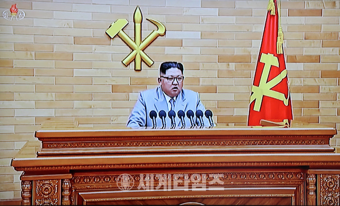 2018년 새해를 맞아 1일 북한 김정은 노동당 위원장이 육성 신년사를 조선중앙TV가 보도하고 있다. 2018.01.01.(사진=조선중앙TV 캡쳐)