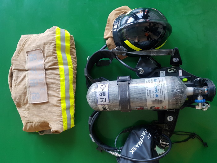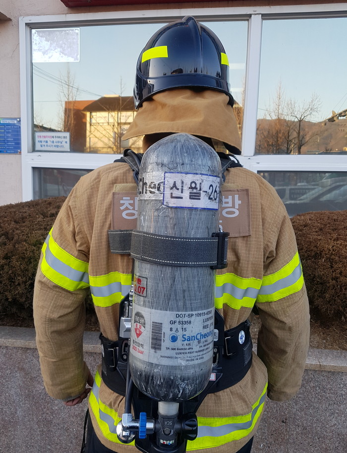 | ▲소방관이 짊어지는 장비의 무게는 산소통 무게 11Kg을 포함해 방화복, 공기호흡기 등 약 27Kg에 달한다. 사진제공-창원소방서 |