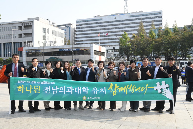 지난 18일 순천시의회는 서울 용산 전쟁기념관 앞에서 열린 전남 의과대학 신설 촉구 집회에 참석해 의대 신설을 요구하는 목소리를 냈다.